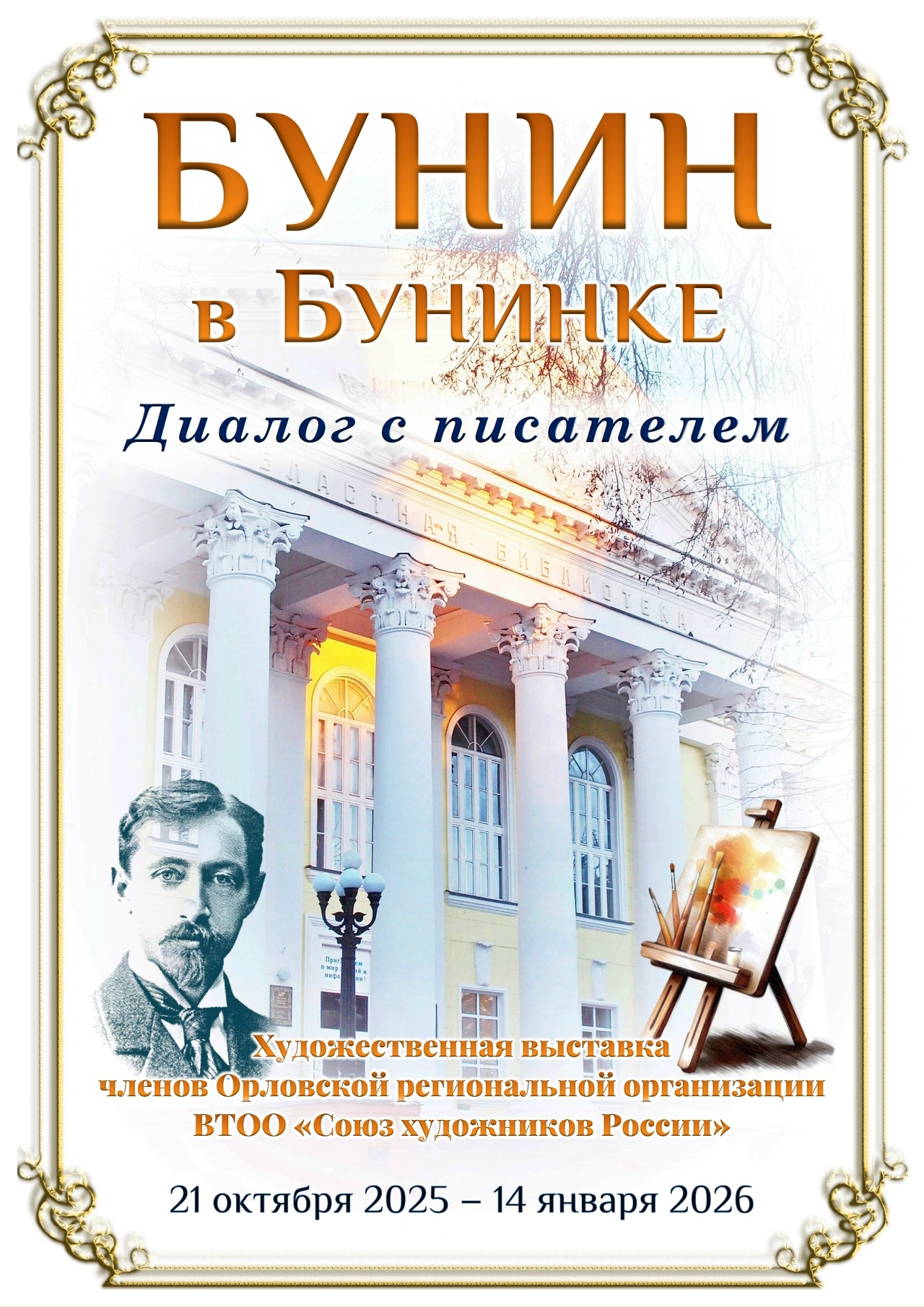 21 октября 2025 года в 15:00 в Орловской областной библиотеке им. И. А. Бунина состоится открытие художественной выставки «Бунин в Бунинке. Диалог с писателем», посвященной 155-летию со дня рождения гения.